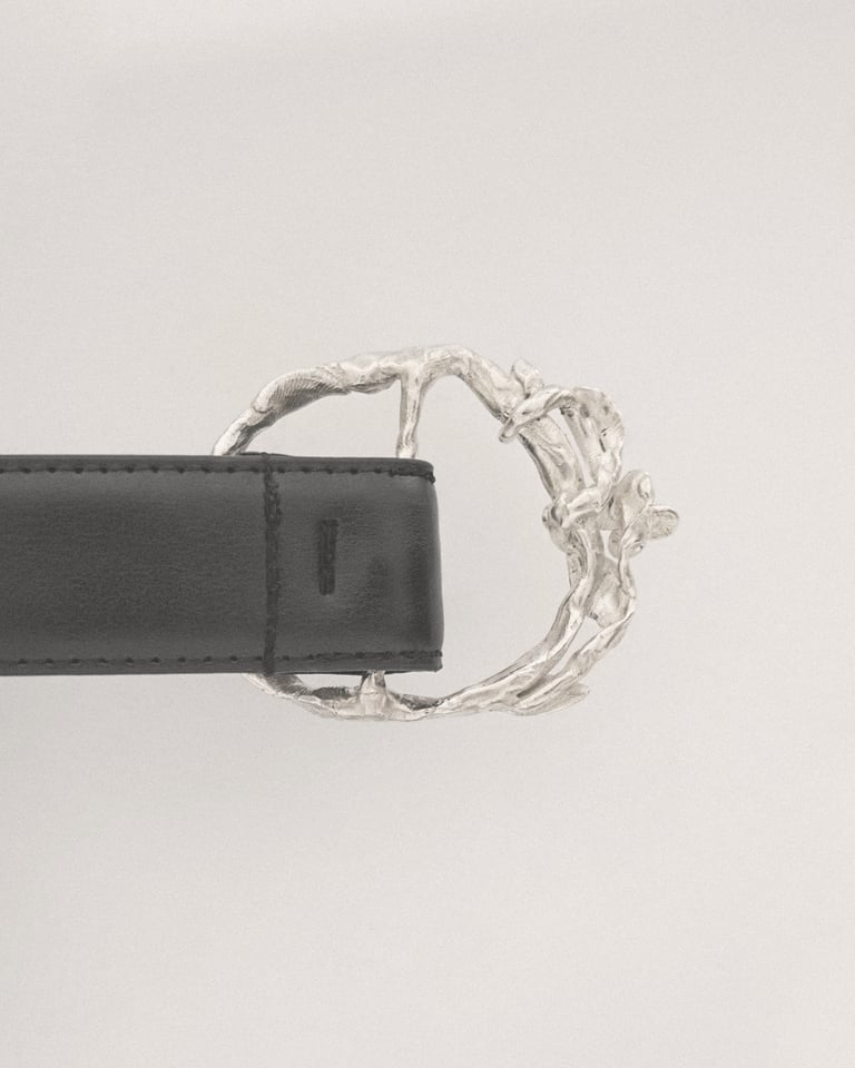 La hebilla de este cinturón se enreda, trepa sobre sí misma. Este cinturón está hecho está hecho a mano con gran atención al detalle en plata y cuero negro recuperado de un cinturón vintage.