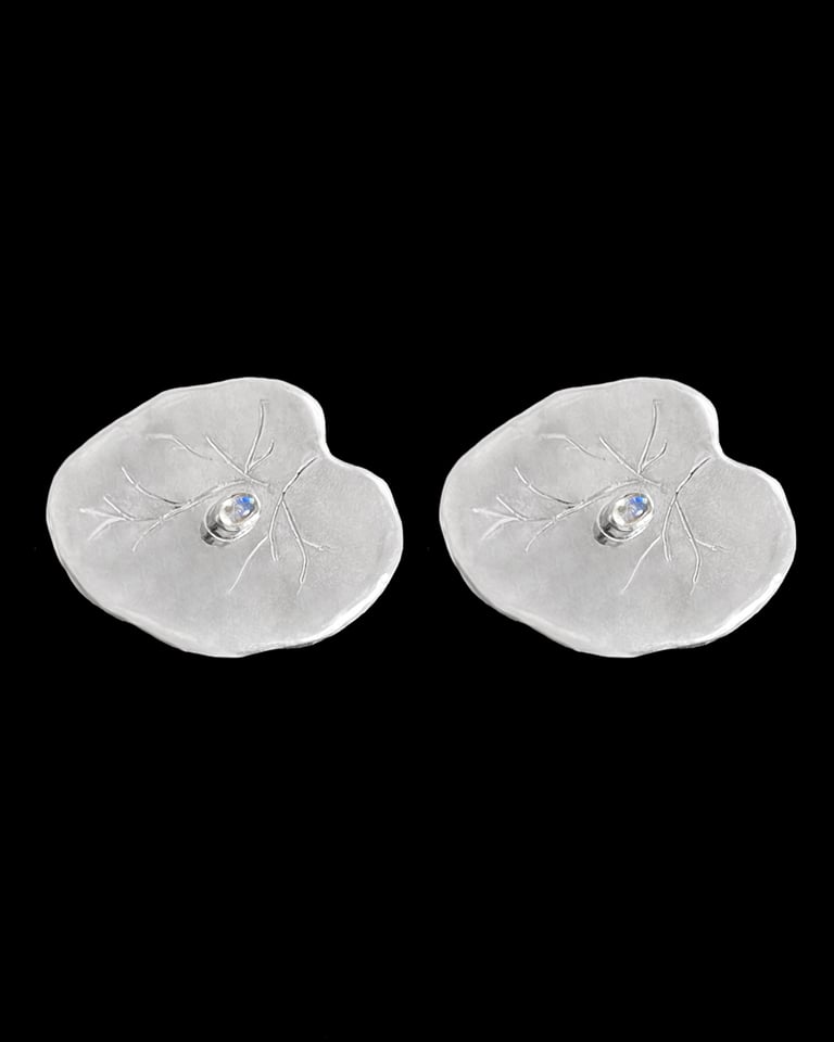 Estos pendientes muestran una gota de rocío en una hoja de loto bañada por la luz de la luna.